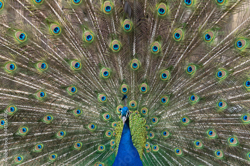 © MatT, Obraz premium Colorful adult peacock with its tail extended. Isolated, colorful.