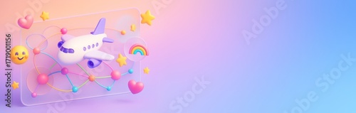 © Who is Danny, Fototapeta premium Colorful airplane with happy elements and rainbow on pastel background with copy space for travel poster, banner, or design template. Ai generative