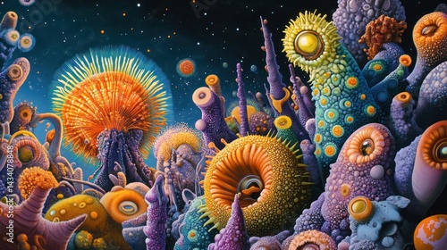 Obraz premium Colorful alien flora filling a vibrant cosmic landscape.