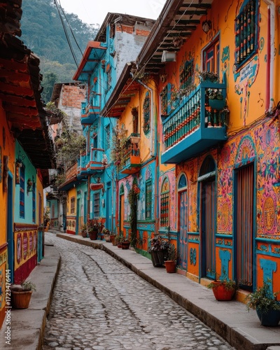 Fototapeta premium Colorful Alleyway: A captivating image of a vibrant streetscape with a narrow cobblestone alleyway flanked by brightly painted buildings.