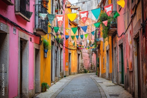 © BerkahStock, Fototapeta premium Colorful alleyway adorned with festive banners and vibrant buildings.