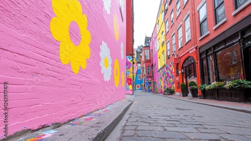Fototapeta premium Colorful alleyway with murals in pink and yellow. Urban street art. Possible use Stock photo for travel, city, and street art themes