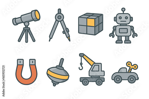 © Viacheslav, Fototapeta premium Colorful Alloy Inventions. Flat vector mini-illustrations alloy inventions in colors children's illustrations: alloy telescope,