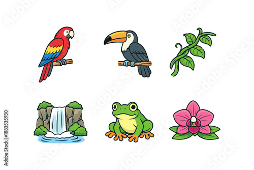 Fototapeta premium Colorful amazon wildlife and nature set: exotic birds, plants, and animals