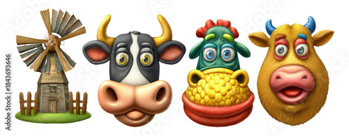 © Lifia, Fototapeta premium Colorful and Fun Cartoon Farm Animal Heads with Windmill and Barn Elements