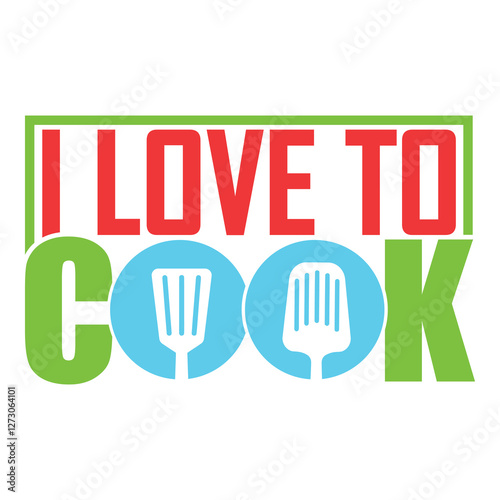 © Badiuzzaman, Fototapeta premium Colorful and fun cooking quote design 'I Love to Cook' with spatula icons.