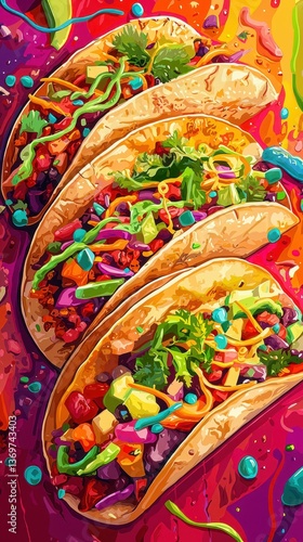 © Kitta Studio, Fototapeta premium Colorful and Realistic Tacos in a Vibrant Background Scene
