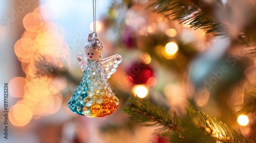 Fototapeta premium Colorful angel ornament hanging from a Christmas tree branch in a warm setting