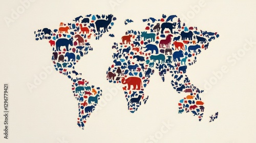 © Ratchanee, Obraz premium Colorful Animal Silhouettes Fill World Map Design for Education Material
