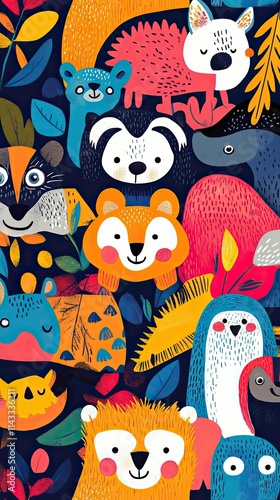 Naklejka premium Colorful Animals Amongst Vibrant Tropical Leaves