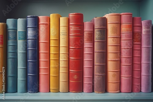 © anastasiia, Naklejka premium Colorful antique books stand in a row on a shelf.