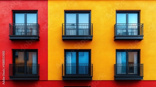 Fototapeta premium Colorful apartment facade with contrasting balconies and windows.