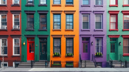 © Waraporn, Fototapeta premium Colorful Architectural Facade With Vibrant Rainbow Windows and Doors in Urban City Neighborhood Residential Building With Contrasting Bright Colors
