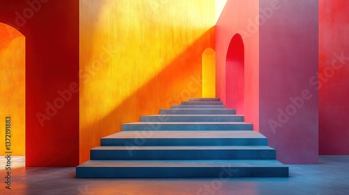 Fototapeta premium Colorful architectural stairs, arches, sunlight in abstract space