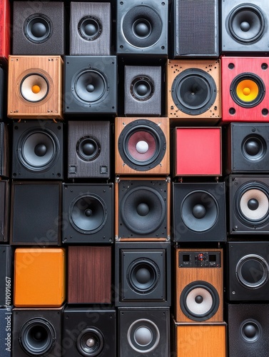 © warunthorn, Obraz premium Colorful Arrangement of Various Speakers on a Stylish Wall Display