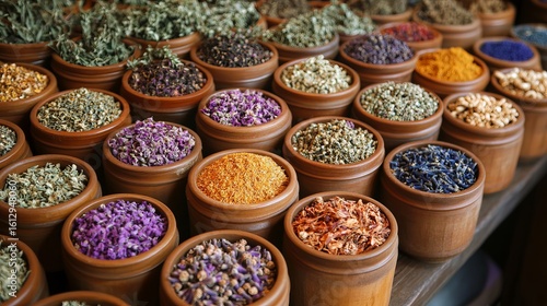 Fototapeta premium Colorful array of dried herbs and spices displayed in wooden bowls at a...