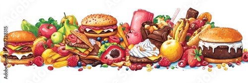 Fototapeta premium Colorful array of food items, featuring burgers, fruits, desserts, and fries