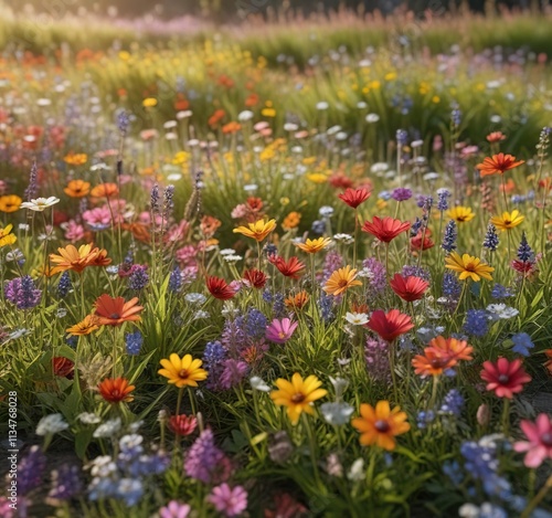 Fototapeta premium Colorful array of wildflowers in a sunlit meadow, colorful flowers,...