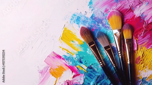 © Isolated studio, Obraz premium Colorful Art Palette with Paintbrushes Isolated on White Background for Creative Projects and Artistic Expressions