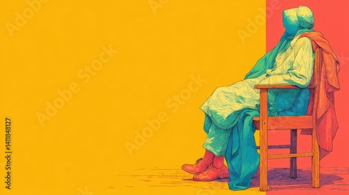 © Sukkamon, Fototapeta premium Colorful Artistic Illustration of a Person Sitting in Chair Against Bold Yellow and Red Background