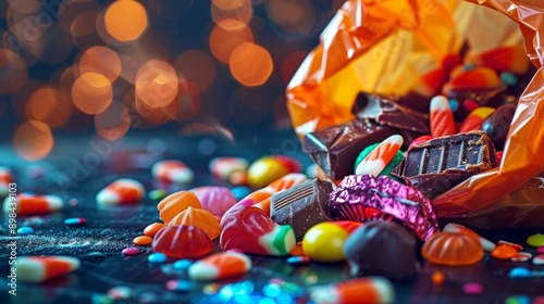 Naklejka premium Colorful assorted candies and chocolates in a plastic bag with bokeh lights....