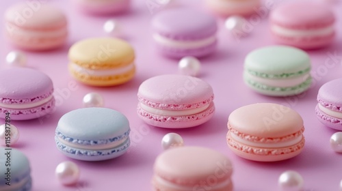 Obraz premium Colorful assorted macarons delicately arranged on soft pastel pearls for a...