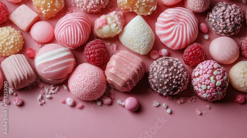 Obraz premium Colorful assortment of candy and sweets displayed on a pink background