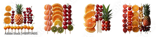 © LAXMI, Obraz premium Colorful assortment of fresh fruit skewers with pineapple, oranges, cherries, grapes, and kiwi, isolated on transparent background