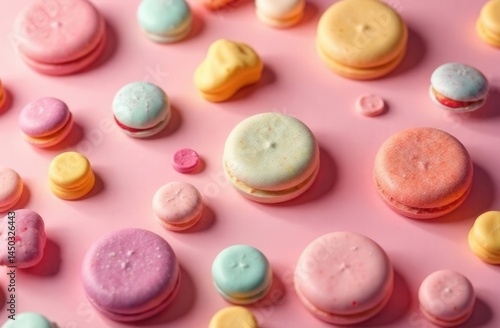 Obraz premium Colorful assortment of pastel macarons on pink background