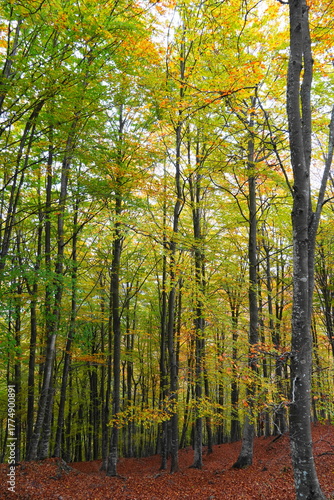 Fototapeta premium Colorful autumn beech forest with golden leaves and soft light in the mountains
