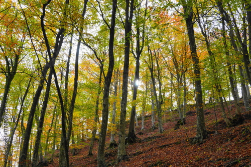 Fototapeta premium Colorful autumn beech forest with golden leaves and soft light in the mountains