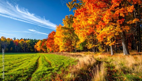 Naklejka premium Colorful autumn foliage, vast green field, and blue sky