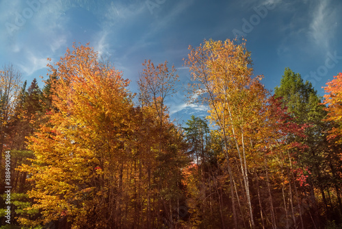© Ann Stryzhekin, Fototapeta premium Colorful autumn forest against the blue sky. Multicolored trees on a sunny autumn day.