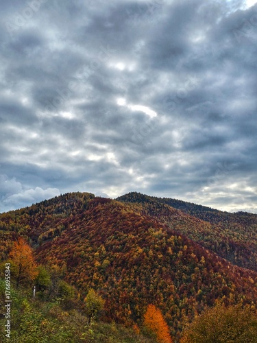 © ManuelaPaula, Fototapeta premium Colorful autumn forest mountain with green, yellow, orange and red trees on a cloudy day. Muntele Rece, Cluj, Romania