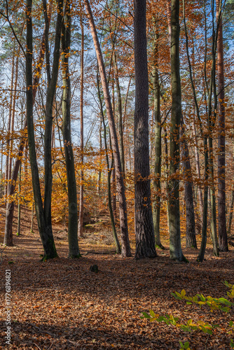 Fototapeta premium Colorful autumn forest with tall trees and fallen leaves in a serene natural setting during a sunny day