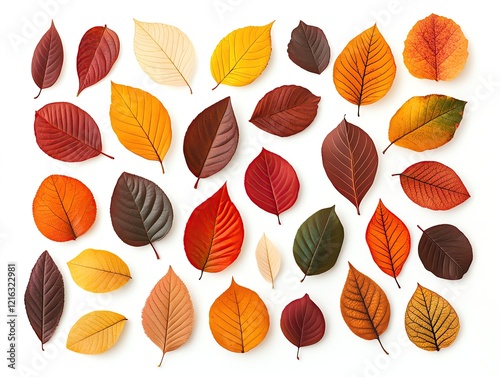 Fototapeta premium Colorful autumn leaves arranged on a white background.