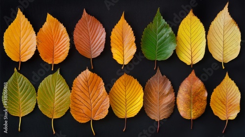Obraz premium Colorful autumn leaves arranged on black background, showcasing changing hues...