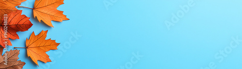 Obraz premium Colorful autumn leaves arranged on cool blue background create vibrant and...