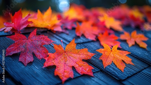 © InspireFrames, Obraz premium Colorful autumn leaves artistically spread across a rustic wooden table surface
