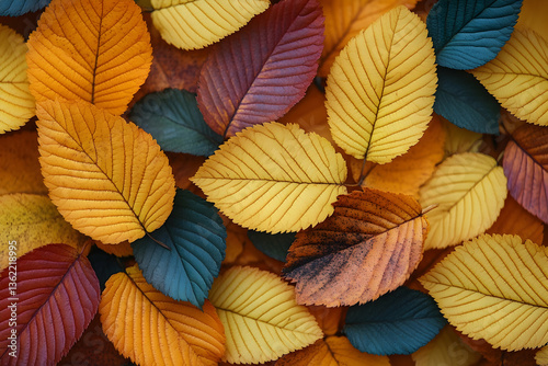 Obraz premium Colorful autumn leaves background with yellow, orange, red, and blue colored...