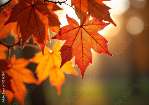 © puruan, Fototapeta premium Colorful autumn leaves glowing in sunlight during a serene evening