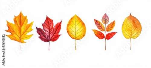 Obraz premium Colorful autumn leaves in various shapes and shades displayed on a white...