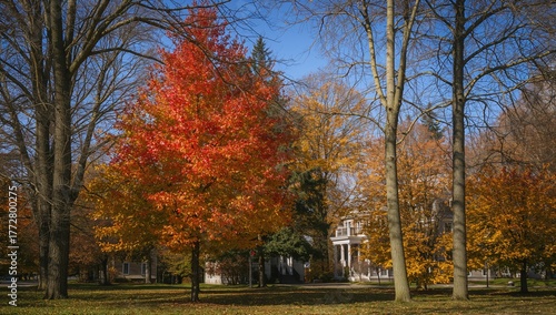 Fototapeta premium Colorful autumn leaves on trees in an urban park setting
