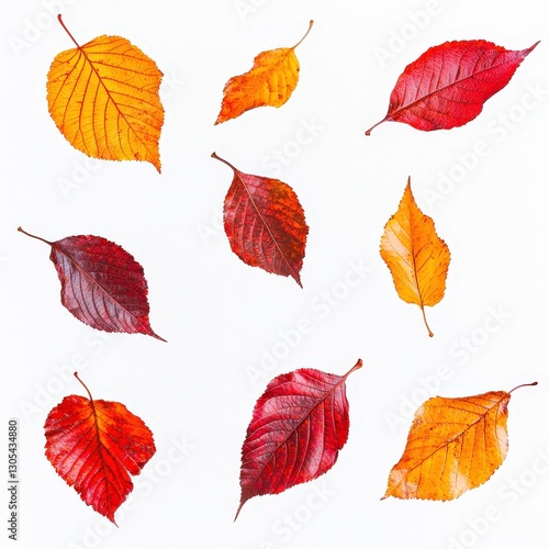 © Philipp, Obraz premium Colorful autumn leaves on white, transitioning from vibrant yellows to deep reds, representing seasonal change and natural beauty. Use for fall designs.
