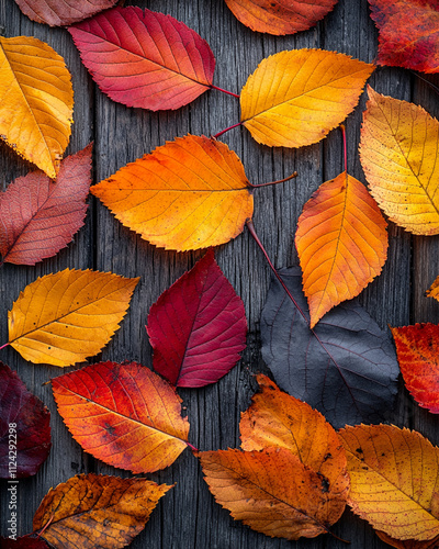 © SR.556, Obraz premium Colorful autumn leaves scattered on wooden surface create warm atmosphere