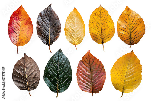 Obraz premium Colorful autumn leaves, various shades, isolated on black background, for nature-themed designs