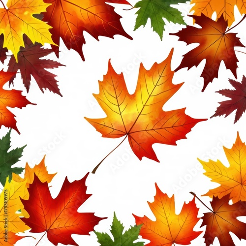 © wiwat apisithpinyo, Obraz premium Colorful Autumn Maple Leaves Creating a Decorative Frame with Vibrant Contrast on White Background