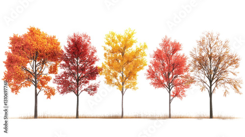 Fototapeta premium Colorful autumn trees with vibrant leaves in shades of red, orange, and yellow against a white isolate background.