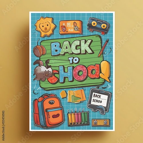 Fototapeta premium Colorful Back to School Design with Fun Cartoon Illustrations and Cheerful Typography