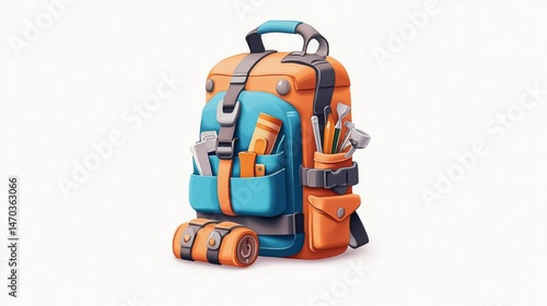 © TSUCHAXAYA, Obraz premium Colorful backpack with tools and supplies, ideal for outdoor activities, crafts, or DIY projects.